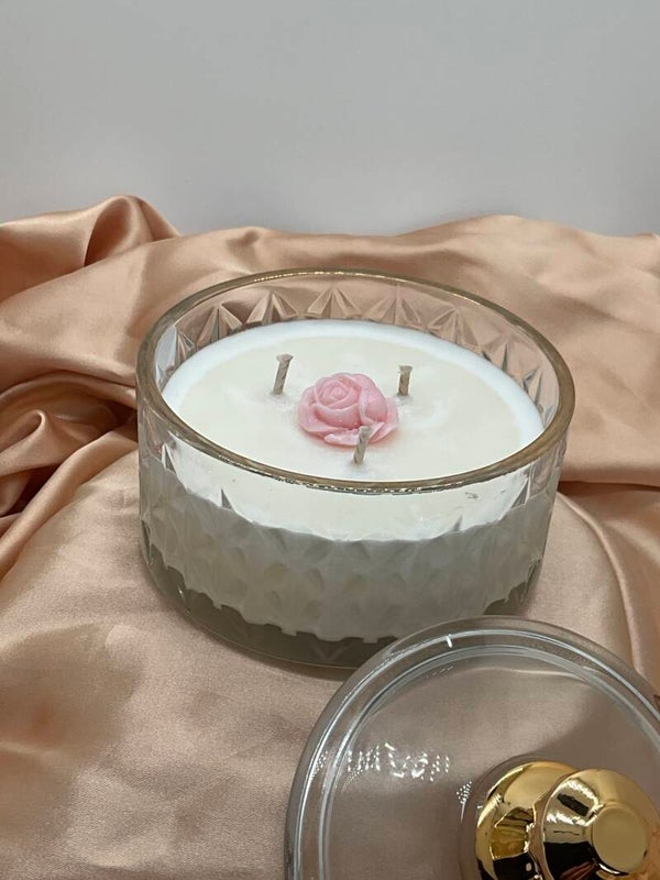 Laissez-vous envoûter par cette pièce d'exception. Présentée dans un somptueux écrin en verre taillé aux reflets cristallins, cette bougie à trois mèches est ornée d'une rose délicatement moulée, transformant chaque allumage en un moment de pur luxe.