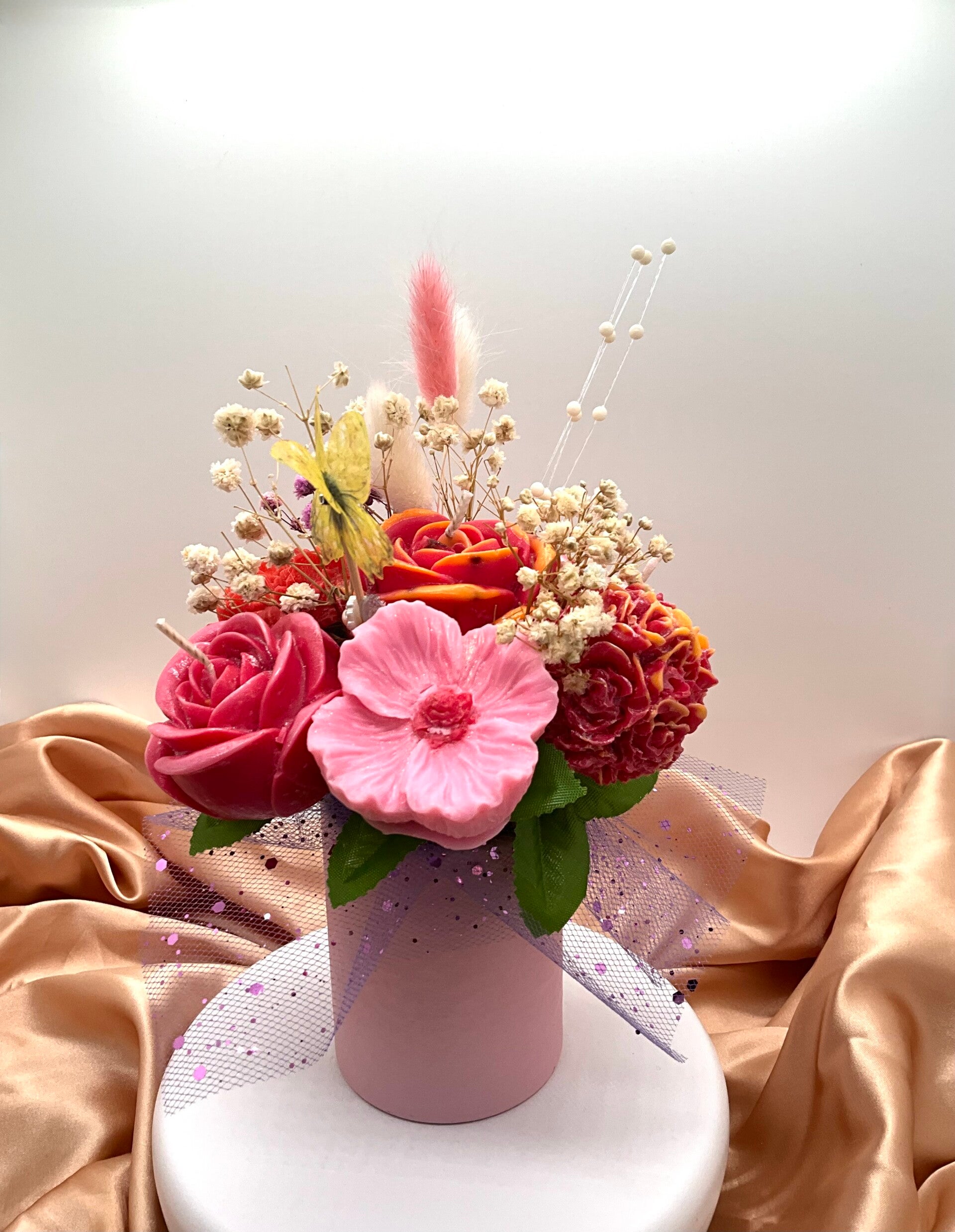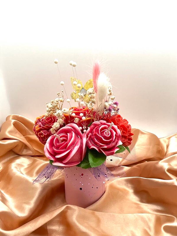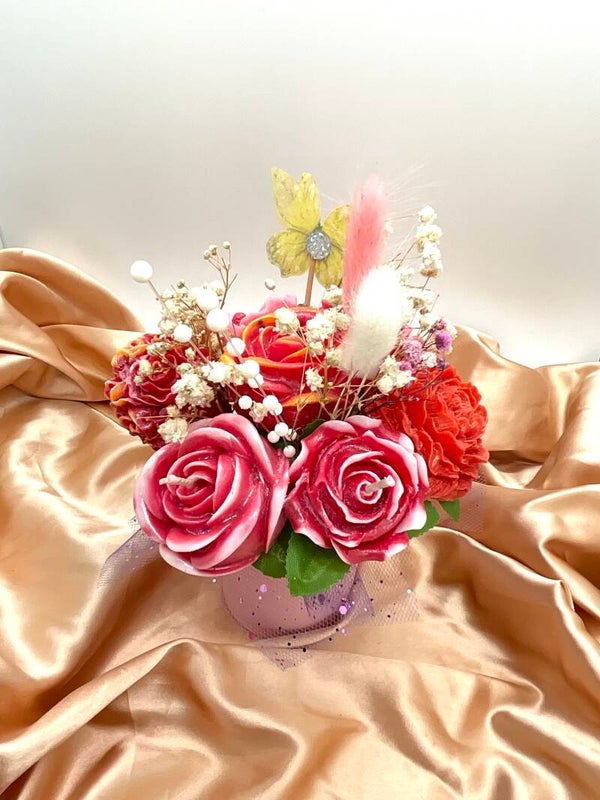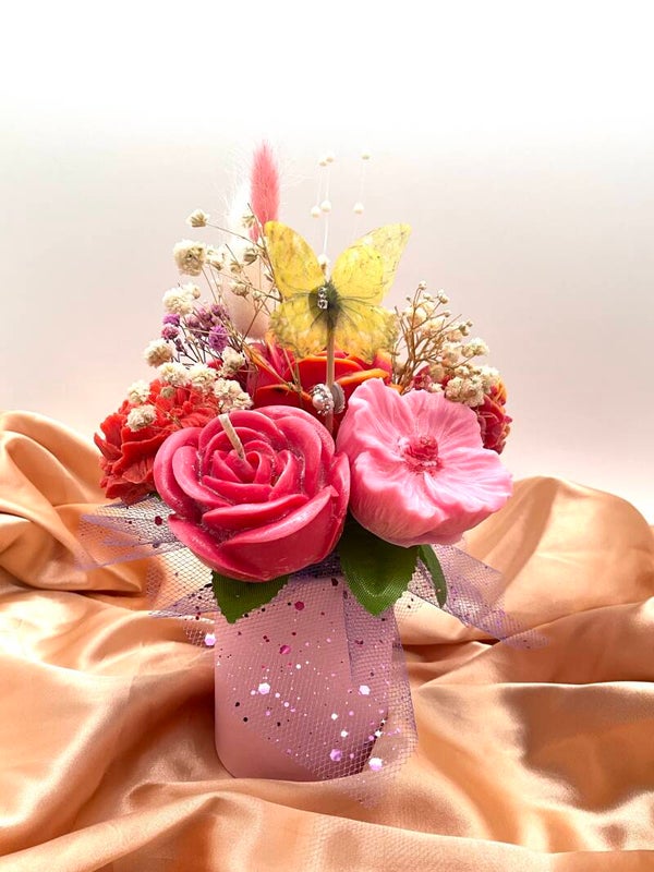 Ce bouquet n'est pas seulement décoratif ! Il est composé de 7 fleurs artisanales, qui sont en réalité de délicates bougies et des fondants parfumés. Un plaisir pour les yeux... et pour l'odorat !